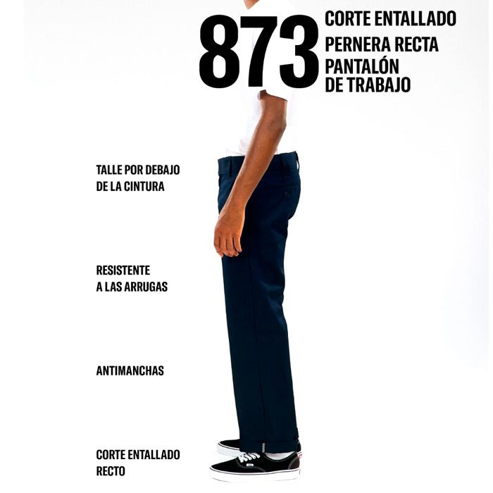 Pantalón largo, estilo chino, de la marca americana DICKIES Work Wear, este es el modelo 873 «Slim Fit Straight leg» de color negro. Pantalones con la pierna recta y la cintura baja. Materiales fuertes de alta calidad y larga duración. Resistente a las arrugas, acabado anti manchas. Es como el Original 874, pero con unas mejoras para adaptar el pantalón al estilo urbano. Corte recto entallado, entrepierna reforzada. Con los pantalones Dickies patina por ejemplo Jamie Foy, uno de los mejores skaters del mundo. Consulta con nosotros por teléfono, email, WhatsApp o Instagram (@picnicskateshop). Todas las talla son 32″ de largo. Material: 65% Poliéster Reciclado, 35% Algodón